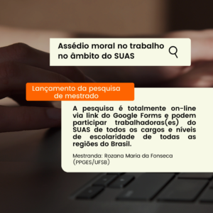Além disso, sou integrante do grupo de pesquisa Práxis (UFRB) e me dedico a cursos, palestras e supervisão, com foco especial nas práticas profissionais e na prevenção e enfrentamento ao assédio moral e violências relacionadas ao trabalho.