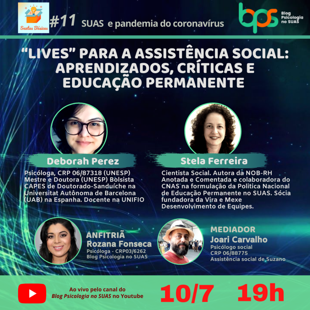 Texto* epígrafe para registrar meus agradecimentos por tantos encontros que me impulsionaram a lidar e a viver nesses mais de 100 dias de pandemia. POÇO DE AFETOS Sinto-me: Afetada por ver todo mundo remando sem querer parar para reconhecer e consertar esse barco furado e que já está afundando. Impotente por ver quantos não pegaram barco algum e nem tiverem o direito de sentir a maresia. Temendo que a Assistência Social seja sempre reeditada na lógica assistencialista e policialesca àqueles aos quais são reservadas ações meramente compensatórias e normalizadoras. Enlutada por mais de 60.000 mil pessoas e pelas tantas perdas que já estavam em curso, mas só agora sentidas. Perplexa pela relativização do que é tragédia, do que é desastre. Entristecida por ver tantas realidades em situação de extrema desproteçao social e jurídica num Brasil que insiste em extirpar direitos e a tratá-las com absoluta indiferença. Testemunhando que em meio a um desastre epidemiológico, vão garantindo um próximo, notadamente humanitário por insustentável precarização e/ou nulo acesso à água potável. Angustiada em ser expectadora cúmplice do descaso com tantas vidas e com toda a natureza que é tratada como desconectada e menor que nós. Mas ainda resta o sentimento de capacidade em reunir forças e possibilidades para o enfrentamento das lutas diárias. E como meio de driblar tantos sentimentos com capacidade paralisante, eu busco potência nos fazeres com o BPS, o que não é diferente com o mais recente: o Sextas Básicas. O que é o Sextas Básicas? É uma série de encontrosÉ uma série de ideiasÉ uma série de possibilidades multiplicadasÉ uma série de afetos contigenciais que me mantêm acreditando que a travessia desse poço, que não está em terra firme, só é possível com o coletivo.É uma série que deixa uma pequena gota neste oceano cheio de ressaca. *Texto originalmente publicado no Instagram @psicologianosuas no dia 02/07/20. Editado Agradecimentos por tantas afetações, reflexões e aprendizados Inicio com agradecimentos ao Joari Carvalho pela coorganização do projeto Sextas Básicas e pela colaboração, esta que se efetivou – quem poderia esperar, no momento mais triste e desafiador para quem precisa continuar construindo a assistência social ao mesmo tempo em que luta pela preservação da própria vida e do SUAS. Essa jornada com o Sextas Básicas só foi possível e foi tão proveitosa porque tivemos a colaboração generosa de tantas convidadas(os) que nos provocaram e nos emocionaram dividindo conhecimentos e nos apontando possibilidades para um fazer mais transformador no SUAS contribuindo com a afirmação da assistência como política pública – agradecimentos especiais à Alice Digam, Leonardo Koury; Abigail Torres, Rosângela Ribeiro; Fernanda Magano, Ionara Rabelo; Paulo Silva, Solange Leite; Rejane Lucena, Adriana Dutra; Maria Carolina Moesch, Lygia Fernandes, Renata Ferreira, Renata Bichir; Ana Bock, Dóris Soares; Lídia Lira, Luane Santos, Marina Leandriani; Márcia Lopes, Rudá Ricci, Déborah Perez e à Stela Ferreira. Juntamente com as(os) convidadas(os), centenas de trabalhadoras e trabalhadores do SUAS ajudaram a construir cada encontro participando ativamente pelo Chat, assistindo e divulgando o projeto através das redes sociais. É muito bom poder contar com companhias que compartilham dos mesmos propósitos quanto a defesa e profissionalização do SUAS. À Bianca Viqueci, meus agradecimentos e cumprimentos pela capacidade de conectar pessoas! Que estejamos ainda mais juntas(os) construindo uma asssitência social sustentável e sustentada por uma práxis.