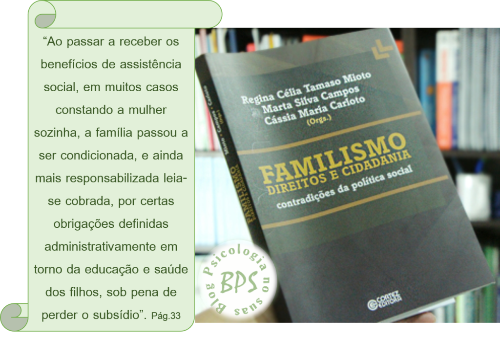 O título deste livro me chamou a atenção imediatamente, e mesmo tropeçando em vários termos e citações de vários teóricos que desconheço (devido minha formação) a leitura deste livro fluiu muito bem e consegui com ele clarear e respaldar vários argumentos ou posicionamento que tenho acerca da nossa atuação nos serviços sociassistenciais, principalmente quando questiono a urgência em rompermos com o “velho” para darmos passagem a novas formas de apreensão da sociedade, dos sujeitos, das famílias e das políticas públicas. Como é um livro feito por várias autoras, os capítulos acabam “reapresentando” termos e conceitos, mas isso foi feito de forma bem costurada ajudando muito na apreensão e compreensão das críticas, argumentos e posicionamentos tomados pelas autoras. Para saber sobre as Resenhas de Livros aqui no Blog Um dos pontos da leitura que gostaria de destacar é sobre a contradição das políticas sociais ao destinar às mulheres o sucesso da materialização dos programas e serviços, reforçando com isso a desigualdade de gênero e sobrecarregando a mulher quanto ao trabalho familiar sem remuneração, prejudicando sua inserção no mercado de trabalho, ou seja, sua autonomia socioeconômica e pessoal continuam distantes, ao passo que é cada vez mais cobrada pelos cuidados com seus membros familiares. “Ao passar a receber os benefícios de assistência social, em muitos casos constando a mulher sozinha, a família passou a ser condicionada, e ainda mais responsabilizada leia-se cobrada, por certas obrigações definidas administrativamente em da educação e saúde dos filhos, sob pena de perder o subsídio”. Pág 33 “Os cuidados familiares não podem se caracterizar apenas como estratégias familiares, basicamente femininas, circunscritas à vida privada”. Pág.89 “A intenção deste trabalho é mostrar que o fato da família ganhar destaque na políticas públicas não implica necessariamente que tenha sido entendida de maneira adequada nem que tenha uma definição uniforme. Essa discussão é necessária por dois motivos: para detectar as funções que o Estado atribui ao núcleo familiar e para perceber os mecanismos de apoio que disponibiliza para o cumprimento dessas funções”. Pág. 127 Considerando que a qualificação do trabalho social no SUAS é tarefa urgente, este livro é uma peça fundamental que ajuda a traçar novas perspectivas e novos rumos na atuação com as famílias. Quais famílias? o que cabe às famílias? elas têm condições de assumir o que o Estado delega a elas? Somos nós técnicos os agentes a “capacitá-las” para exercerem a proteção social, e com isso reafirmarmos esta lógica “perversa” do Estado? ou seremos os agentes provocadores de autonomia, gerando condições para se reconhecerem nessas contradições éticas e políticas? Familismo direitos e cidadania – contradições da política social é também um livro indicado para os profissionais que atuam com famílias em diferentes políticas públicas como na saúde (NASF, ESF, Programa Melhor em Casa), principalmente o capítulo Serviços sociais e responsabilização da família: contradições da política social brasileira. Regina Célia Tamaso Mioto e Keli Regina Del Prá – Pág. 147 Enfim, é uma leitura que provoca várias perguntas que no mínimo nos tiram do lugar, processo fundamental para se produzir novos fazeres. (O leitor que é cadastrado aqui no Blog pode comprar este livro na Cortez Editora com 20% de desconto utilizando o código: psicologiacortez) – Boa leitura!