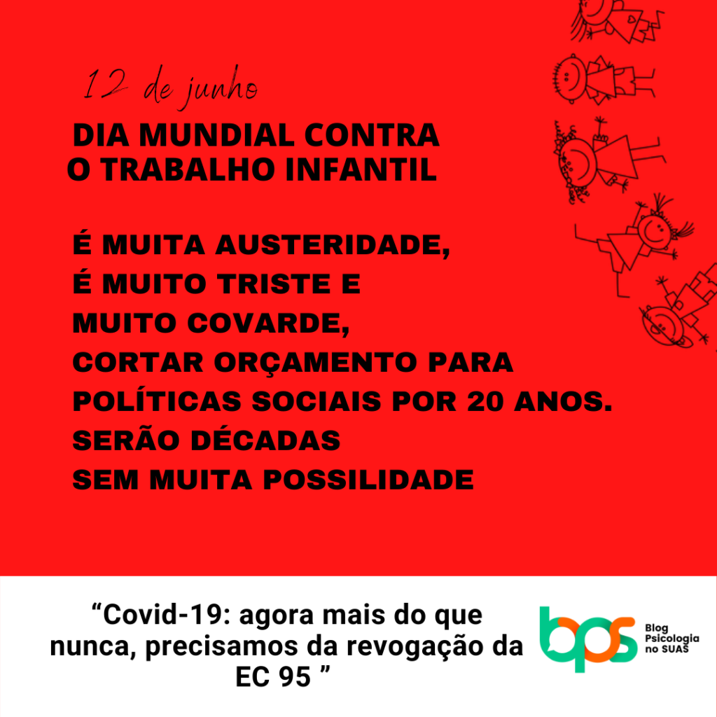 Dia Mundial contra o Trabalho Infantil É muito cedo, É muito triste e Muito covarde Cortar infâncias pela metade. “Qualquer criança menor de 14 anos que for encontrada mendigando fora da paróquia onde habita […] será enviada à escola de trabalho mais próxima, será fortemente açoitada e trabalhará até o pôr do sol […] Devem ser instaladas escolas de trabalho em todas as paróquias, e as crianças [pobres] entre 3 e 14 anos […] devem ser obrigadas a ir [para torná-las pessoas] […] sóbrias e industriosas [e, graças a seu trabalho,] o ensino e a manutenção de tais crianças durante o período não custará nada à paróquia. John Locke – Political Wrítings citado por : Várnagy, Tomás. O pensamento político de John Locke e o surgimento do liberalismo. Referência completa clique aqui Pensando aqui na campanha 2020 do Dia Mundial contra o Trabalho Infantil e sabe o que é muito triste? É saber que John Locke, considerado o pai do liberalismo, defendia trabalho infantil como educação e como formação de caráter, isso lá no século XVII e ainda hoje as políticas neoliberais e as medidas de austeridade defendem, perversamente, a mesma situação e este destino para as crianças e adolescentes pobres quando aprovaram as reformas trabalhista e previdenciária e quando vigorou a EC 95 (2016). Sabe-se que foram aprovações de projetos em disputa desde os anos 90. Na década seguinte o pacto federativo e social ganhou um fôlego e impôs avanços, mas o Locke mostra que a violência estrutural institucional é muito mais antiga e persistente. Então não se engane, o liberalismo de hoje sabe que o trabalho infantil é o destino para as crianças e adolescentes pobres, só que com roupagem humanizada. A lógica é certa, quanto mais desemprego, mais as crianças e adolescentes são e serão expostos a situações graves de trabalho precoce, assim como a várias outras violências e riscos. E quem são essas crianças e adolescentes? A maioria são as pretas. Trabalho infantil é mais uma violência, resultado do projeto de branquitude do País. É triste. É triste saber que trabalhadoras e trabalhadores da assistência social e de outras políticas sociais, acabam como agentes enxugadores de gelo ao atuar em programas e serviços que visam normatizar e manter essa roupagem humanizada do suposto cuidado pelo sistema violento. Não dá para enfrentar o trabalho infantil sem enfrentar o capitalismo e suas políticas neoliberais. Ou atuaremos para uma transformação dessa sociedade que já não dava certo muito antes da pandemia ou seguiremos sendo agentes pacificadores e distribuidores de falsas promessas esperanças. Lutar contra o trabalho infantil é lutar pela Revogação imediata da Emenda Constitucional 95 que congela os investimentos públicos por 20 anos. A pergunta que eu deixo aqui é: seremos parceiros de lutas pela mitigação dos efeitos do trabalho infantil ou seremos agentes de combate a esta violência estrutural? O caminho é com transformação social, sendo anticapitalista, antirracista e antifascista. Para começar a subverter, a campanha do Blog Psicologia no SUAS contra o trabalho infantil será essa: Acompanhe o BPS nas redes sociais (https://linktr.ee/psicologianosuas) Leia mais