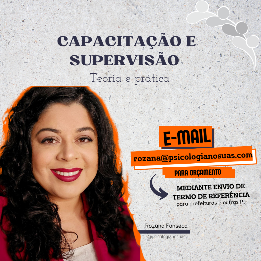 IMPORTANTE: Para prefeituras e outras PJ a via de contato é exclusivamente por e-mail: rozana@psicologianosuas.com Para solicitação de orçamentos, favor enviar o Termo de Referência. Como funciona a supervisão on-line: Obs: Para os demais serviços consultar através do e-mail: rozana@psicologianosuas.com O que é? Orientação técnica aos trabalhadores do SUAS (pessoa física ou pessoa jurídica). Como é realizada? Na modalidade on-line pelo Google Meet. Recursos necessários: Computador com acesso a internet. Recomendo o uso de fone de ouvido com microfone. Escopo dos temas supervisonados: Trabalho Social com Famílias CRAS – CREAS – SCFV – Centro Pop – Acolhimento institucional. Trabalho em grupo. Atendimento e acompanhamento familiar – Plano de acompanhamento Familiar – PAF ou PIA. Elaboração de documentos. Diagnóstico socioterritorial. Funções da coordenação de unidades como CRAS, CREAS. Outros temas podem ser acordados com a profissional. Duração de cada supervisão: Cada supervisão dura uma média 1h20. A quantidade e a periodicidade: O número de encontros realizados dependerá da demanda e poderá ter periodicidade semanal, quinzenal, mensal ou outros intervalos . Assim como pode ter apenas um encontro. Pagamento: É realizado através de PIX ( Chave a ser disponibilizada por WhatsApp) – Obs.: O pagamento deve ser realizado antes da supervisão com o envio do comprovante de depósito para ou WhatsApp: (73) 99981-0221 P.S: Caso o profissional não compareça no horário agendado o valor não será devolvido. A devolução do valor pago ocorre quando a comunicação é realizada até 4 horas antes do horário agendado. Honorário: através do e-mail rozana@psicologianosuas.com Disponibilidade: dias e horários a combinar PARA PREFEITURAS e outras PJ A VIA DE CONTATO É EXCLUSIVAMENTE POR E-MAIL: rozana@psicologianosuas.com Acompanhe o Instagram do Blog e da autora: @psicologianosuas Acompanhe as atualizações do BPS pelas redes sociais Se inscreva para seguir o Blog Psicologia no SUAS e receber as novidades!