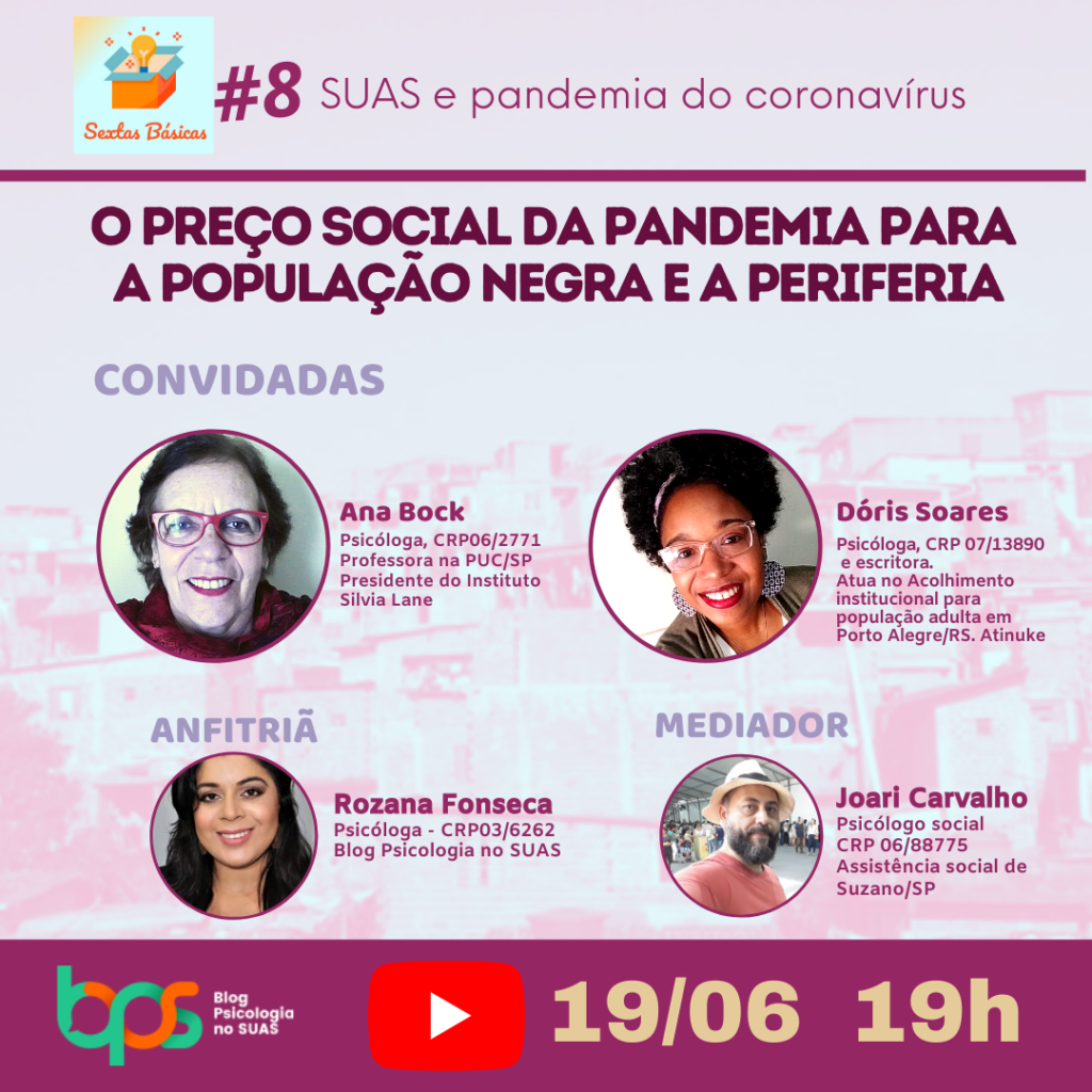 Por Rozana Fonseca e Joari Carvalho Para a edição #8 do Sextas Básicas – encontros on-line do Blog Psicologia no SUAS, elegemos o tema O preço social da pandemia para a população negra e a periferia com o propósito de construir um debate sobre estes dois assuntos uma vez que a população negra e os moradores das periferias são quem mais usam os serviços da Assistência Social, entendendo que ainda há uma lacuna significativa quanto a formação e a atuação crítica com práticas emancipatórias e reconhecedoras das potências e lutas históricas da população negra e da periferia. Para conhecer o projeto Sextas Básicas e ver a lista com todos os vídeos das edições já realizadas, clique aqui Um desastre afeta desigualmente os desiguais. Quem vive em situação mais vulnerável ao tipo de ameaça a que tem de se expor arca com mais danos e prejuízos. O Brasil interrompeu sua lenta trajetória de redução das desigualdades de renda, escolaridade, alimentar, entre outras, muito atravessadas pelo preconceito racial contra população negra e a quase estratificação social sistêmica que mantém a maioria da população em condições de pobreza e miséria, sem perspectiva de mobilidade social ou melhor acesso a bens e serviços que reduzissem ou contornam o abismo. Embora fenômenos sociais reais específicos em suas formas de produção e reprodução, manifestam-se interligados na realidade, o que exige atenção redobrada de quem analisa, como trabalhadores, gestores, conselheiros, pesquisadores e cidadãos que usam direitos de assistência social, para não cometer omissões. A pandemia sanitária recapitulou que a saúde se trata de bem estar físico, social e mental, e não só dos corpos comuns desconectados de onde e como se vive, trabalha, estuda e tem suas realizações sociais. Os considerados determinantes sociais da saúde no Brasil colocaram em xeque estratégias importadas de outros contextos de convivência em meio a menores desigualdades. Enquanto se tenta combater a epidemia, em meio a desencontros e oportunismos entre autoridades e tomadores de decisão, o impacto da doença vai revelando seus efeitos mais drásticos sobre as populações negras e das regiões periféricas, enquanto com mais ou menos auto-organização e atendimento de assistência social as pessoas e as comunidades vão tendo de participar da formulação das medidas de quarentena possível no contexto prático. A Política de Assistência Social, ainda que sua base de sustentação legal não tem expressado o desafio em relação ao enfrentamento da desigualdade racial, o que pode ter sido reservado para diplomas próprios, tangenciou pela diretriz de descentralização política e administrativa de suas ofertas com sua a desigualdade associada com a estratificação populacional inscrita pela lógica gentrificadora dos territórios urbanos, cada vez mais perpetuando a forma de organização da vida social. Entretanto, a Assistência Social se reencontra com o enfrentamento de efeitos de ambas desigualdades às quais ambos grupos em separado ou conjunto são condicionados pelos sistema político, econômico e, porque não, subjetivo vigente, quando se trata do enfrentamento da pobreza como pressuposto de seus objetivos na forma de assegurar autonomia de renda. É preciso então desfazer as omissões para se resgatar o caráter interdependente entre as dimensões da questão racial e periférica, ainda que não se reduzam a única problemática. Tema: “O preço social da pandemia para a população negra e a periferia” Quando: sexta-feira (19/06)Horário: 19hCanal do Blog Psicologia no Suas no YouTube Para este debate, as nossas convidadas são: Ana Bock e Dóris Soares Sobre as convidadas e coorganizadores do encontro virtual: Ana Bock – Psicóloga, nº 2771 – Professora na PUC/SP e presidente do Instituto Silvia lane. Doris Adriana Pinto Soares– CRP 07/13890Mãe da Emanoela e Benjamin, mulher, preta, psicóloga e escritora. Servidora pública do município de Porto Alegre-RS, trabalhadora da Política de Assistência Social, atualmente atua no acolhimento institucional para população adulta. Experiência de 15 anos na Assistência Social, nas diferentes complexidades, destaco a vivência na coordenação de CRAS (5anos), Supervisão e nas medidas socioeducativas. Componho como colaboradora a Comissão de Políticas públicas e a Comissão de Relações Étnico Raciais do Conselho Regional de Psicologia do RS. Experiência enquanto conselheira no Conselho Municipal de Assistência Social e no Conselho Estadual de Assistência Social (2019-2021) enquanto representante do Fórum estadual de trabalhadoras e trabalhadores do SUAS RS. Atinuke- Coletivo de Mulheres Negras A mediação é de Joari Carvalho – Psicólogo social – CRP 06/88775. Atua no órgão gestor da assistência social de Suzano – SP. Mestrado em psicologia social. Ex-colaborador convidado da Comissão Nacional de Psicologia na Assistência Social do CFP (2018 e 2019) e ex-conselheiro membro do Núcleo de Assistência Social e do Núcleo de Emergências e Desastres do CRP- SP (2009 a 2016). Coorganizador do Sextas Básicas. A anfitriã é Rozana Fonseca, criadora deste espaço, que o tem com o lema agregar todas e todos que se debruçam à construção do SUAS. Link para assistir ao Sextas Básicas #8 Canal do BPS no Youtube ou clique no vídeo abaixo. Esperamos vocês para o nosso encontro virtual #8. Lista com todos os vídeos das edições já realizadas Sextas Básicas #1 Sextas Básicas #2 Sextas Básicas #3 Sextas Básicas #4 Sextas Básicas #5 Sextas Básicas #6 Sextas Básicas #7 Sextas Básicas #8